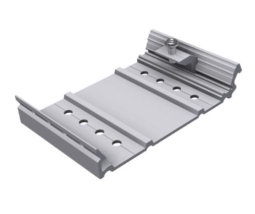 Aufnahmeplatte der Konsole. Zur flexiblen Montage der Dachhaken von Alpha Platten. Seitliches Verschieben der Konsole am Dachsparren. Zusätzliche Aufnahme für Erdung.