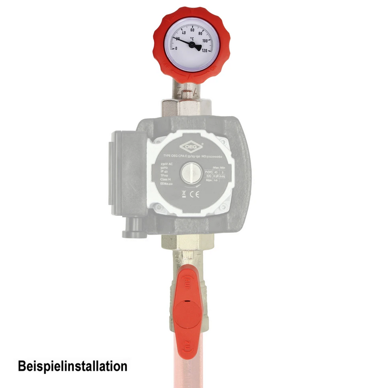 problemloser Pumpentausch möglich. Das Thermometer ist im oberen Kugelhahn integriert.